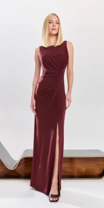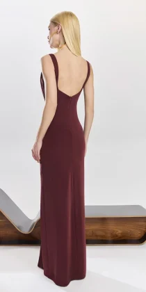 Vestido longo vinho com decote nas costas em detalhes trançado.