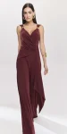 Vestido com recorte na frente e aberto nas costas e saia reta traspassada.