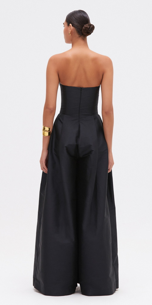 Macacão em tafetá com flor aplicada no busto, fechamento em zíper nas costas.