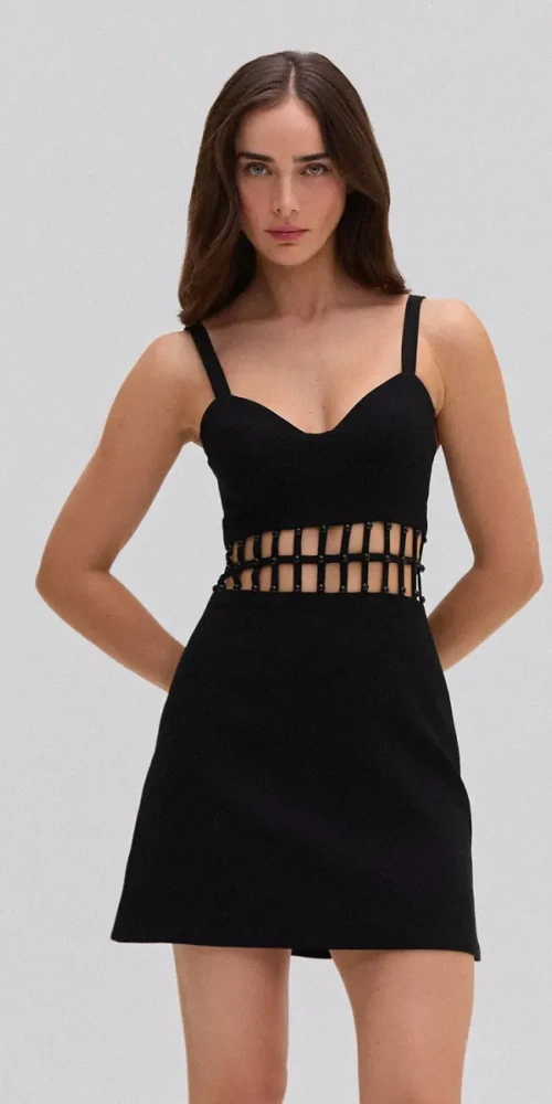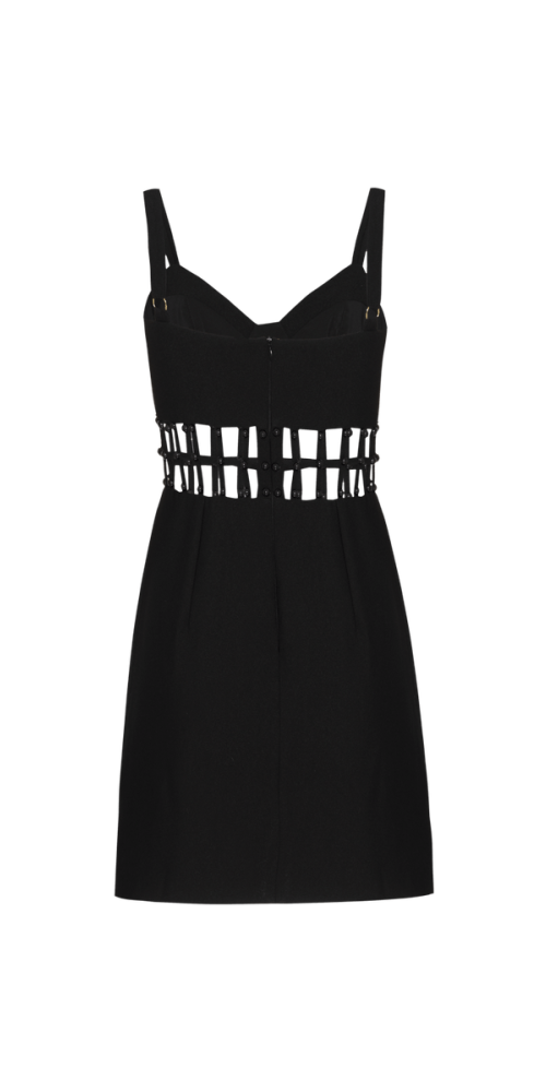 Vestido curto confeccionado em crepe com forro, possui bordado, recorte vazado na cintura com tiras na vertical e horizontal, alças com regulador e zíper invisível nas costas