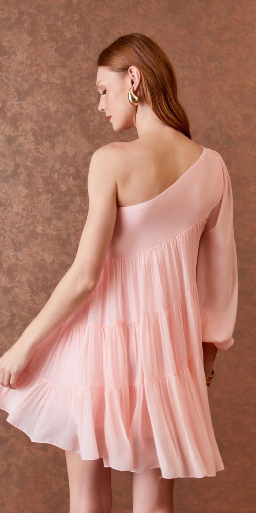 Vestido curto ombro só em camadas.