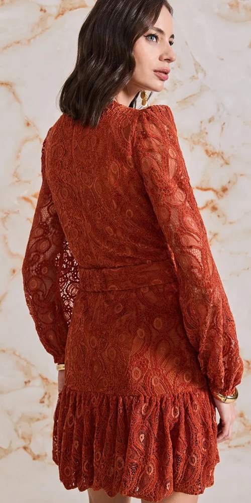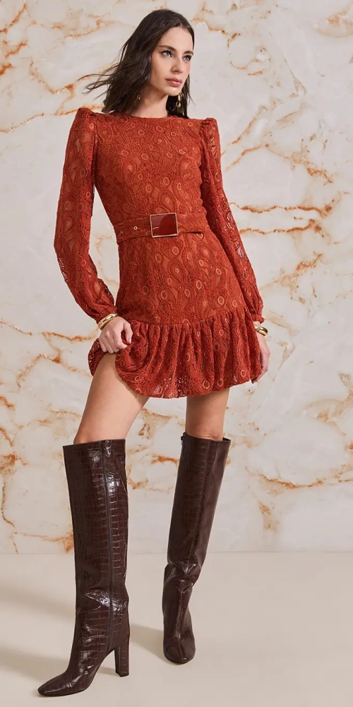 Vestido curto confeccionado em renda trabalhada, ideal para adicionar um toque de elegância especial ao seu guarda-roupa. As mangas longas apresentam um sutil volume no ombro, proporcionando uma silhueta graciosa. O decote redondo clássico valoriza o colo de forma discreta. A cintura é definida por um cinto regulável no mesmo material, com uma fivela retangular em resina que estrutura o visual e realça a sua forma. Possui fechamento em zíper invisível atrás. A saia, com um delicado franzido na barra, oferece movimento e um acabamento feminino. Totalmente forrado para garantir conforto e um caimento impecável.