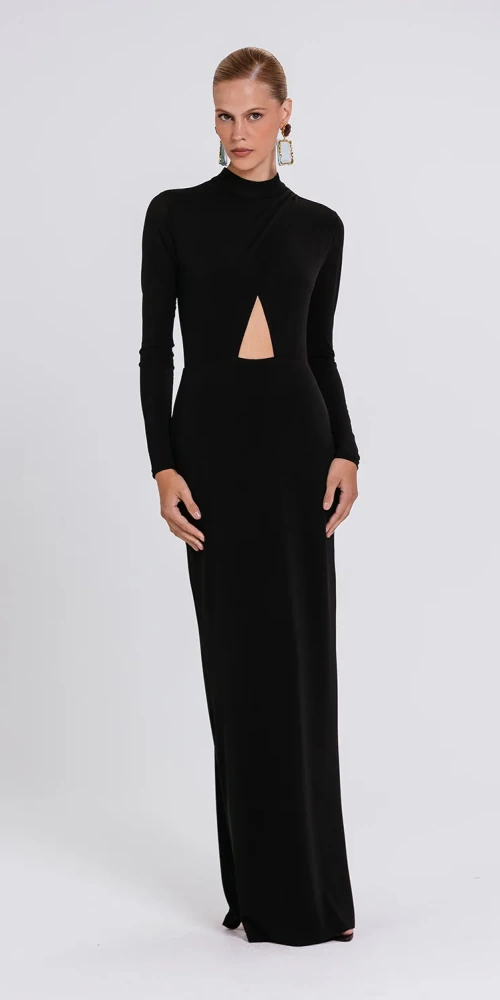 Vestido longo, mangas longas com detalhe vazado no busto.
